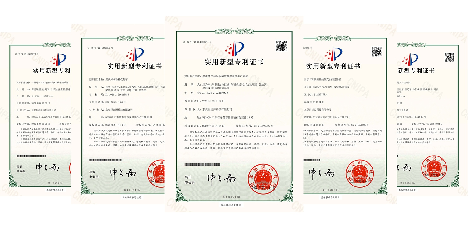 近日,經國家知識產權局審查,東莞巨正源科技有限公司的“聚丙烯氣體回收裝置及聚丙烯生產系統”、“聚丙烯水粉料收集車”、“一種用于PDH裝置提高C3收率的系統”等23項實用新型專利正式獲得授權。