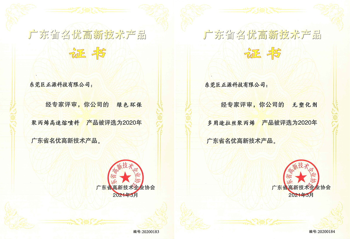 近日,巨正源科技公司自主研發、生產的“綠色環保聚丙烯高速熔噴料”、“無塑化劑多用途拉絲聚丙烯”兩類產品榮獲“廣東省名優高新技術產品”稱號,標志著巨正源的高分子材料研發取得新成效、邁上新臺階。