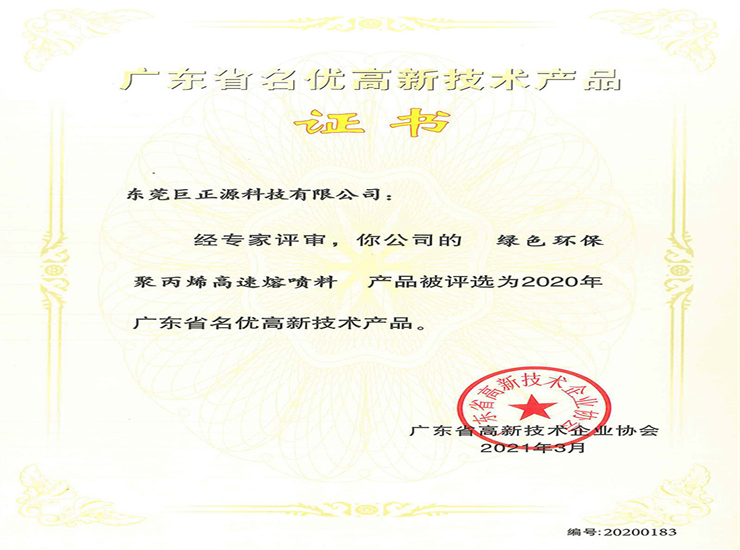 • 廣東省名優高新技術產品證書(熔噴料)點擊查看大圖